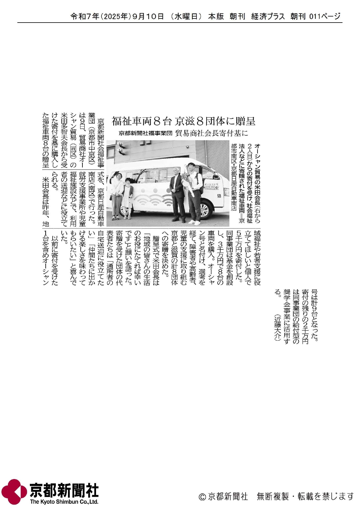 Last year, Mr. Yoneda personally donated 50 million yen to the Kyoto Shimbun Social Welfare Organization, expressing his wish for the funds to be used to support community welfare and youth development. Of this donation, 30 million yen was used to purchase welfare vehicles, which were then donated to eight organizations—including employment support centers and child welfare facilities—across Kyoto and Shiga prefectures, following a selection process.