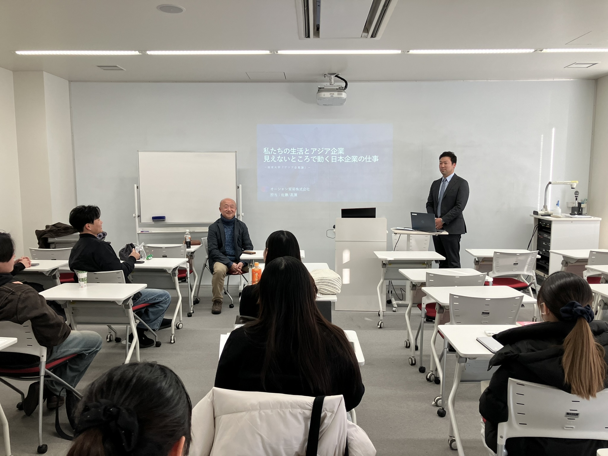 経済学部の学生を対象に、当社が海外取引の現場で取り組んでいる内容や、海外、特にアジア諸国におけるビジネス展開の特徴をご紹介しました。また、昨今の労働人口減少を背景とした国内での外国人採用の取り組みや課題についてもお話ししました。